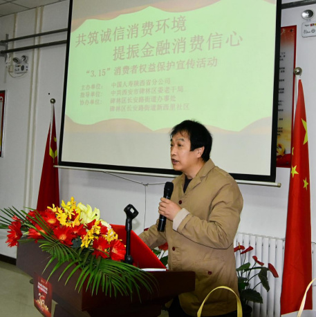 为增强消费者权益保护能力,提升公众风险防范意识,构建和谐金融生态环境,3月15日下午,中国人寿陕西分公司协同西安市碑林区老干局、碑林区长安路街道办在新西里社区开展以“共筑诚信消费环境 提振金融消费信心”为主题的“3·15”消费者权益保护教育宣传活动,省公司党委委员、副总经理刘晓朝出席活动并致辞。