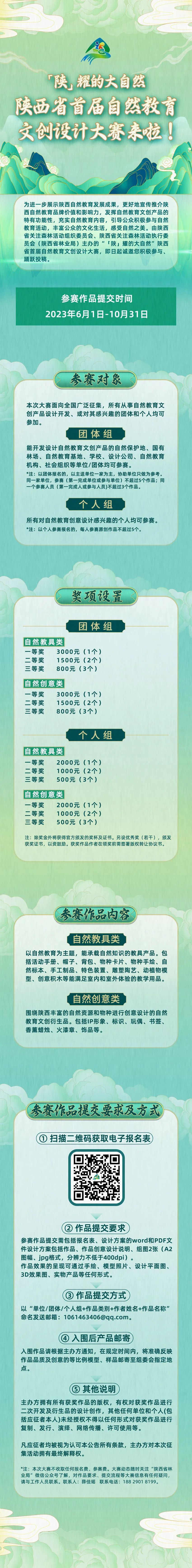 “陕”耀的大自然——陕西省首届自然教育文创设计大赛来啦! 2023年9月21日 13:56 经过近一个月的作品征集 组委会已经收到了来自 西安、长春、河南、山西等 全国各地的文创设计作品 各式各样的作品千姿百态各有千秋~ 不得不佩服大家的效率真是杠杠的! 当然还在寻找灵感和设计的伙伴们不要着急 本次大赛给大家充足的作品征集时间 截至2023年10月31日 均可提交参赛作品 本次比赛以 自然教具类和自然创意类 两个赛道为主 各类自然标本、手工制品、特色装置、 雕塑陶艺、动植物模型、标识、 玩偶、书签、香薰蜡烛、火漆章等 打开脑洞让灵感大爆发 不论你是个人还是团体 欢迎志同道合的小伙伴 一起来实现梦想! 还有千元奖金等你带回家~ 陕西省首届自然教育文创设计大赛 火热进行中 创意无限让梦想“陕”耀 等你来投稿! 【作品提交要求】 参赛作品提交需包括报名表、设计方案的word和PDF文件,设计方案包括作品、作品创意设计说明、组图2张(A2图幅、jpg格式,分辨力不低于400dpi) 【作品提交方式】 以“团体/个人组+大赛类别+作者姓名+作品名称”命名发送邮箱:1061463406@qq.com 注:本次大赛不收取任何报名费、参赛费。大赛动态随时关注“陕西省林业局”微信公众号了解,对作品要求、提交流程等大赛信息有任何疑问,请与工作人员联系。 联系人:薛佳瑶 联系电话:18820918199