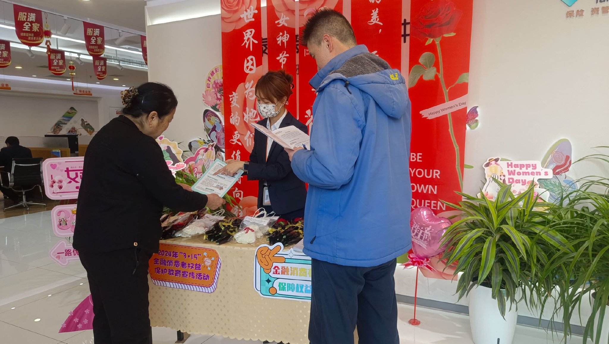 3月8日为当天前来新生活广场办业务的客户赠送一束公司精心准备的鲜花,将美好的祝愿送给客户;并向客户详细讲解消费者八大权益,并通过彩页、案例讲解,心得交流等方式向客户传递消保知识,增强消费者的风险意识和维权意识。
