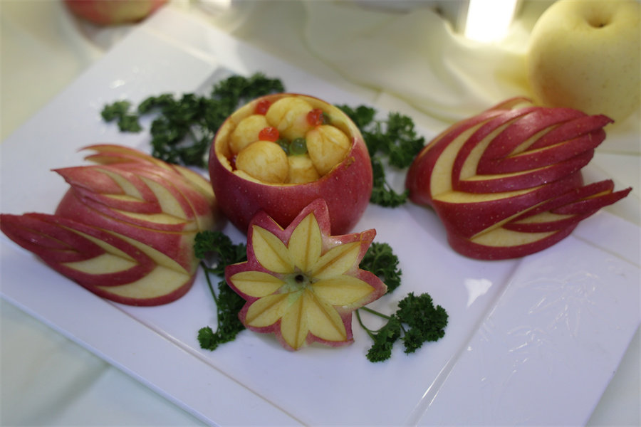 洛川宾馆综合部部长羽秦介绍,参展的所有的菜品都加入了苹果食材,有中餐、西点、饮品、汤羹四类,26种菜品。希望通过菜品这种方式,让更多的消费者去了解苹果在饮食当中的多元化搭配方式。