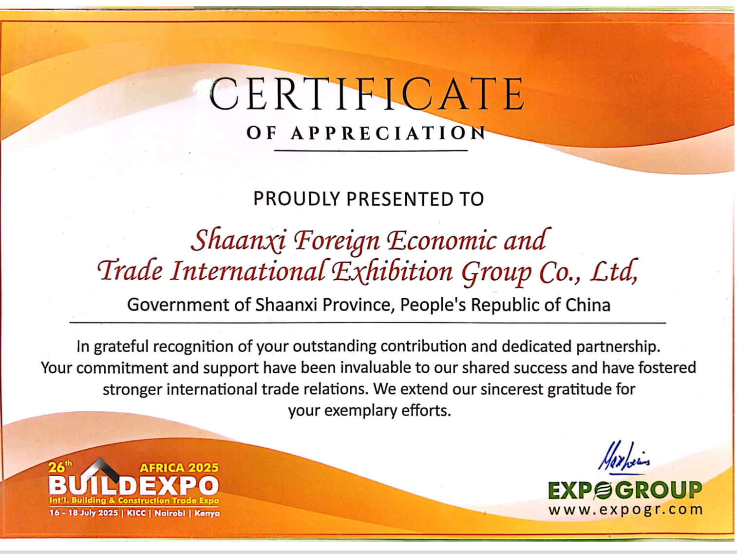 7月18日(肯尼亚时间),第26届肯尼亚国际建筑建材展(BUILDEXPO AFRICA)在内罗毕圆满落幕。由陕西国际经贸会展集团组织的陕西西昂科技集团有限公司、杨凌水核建材有限公司、陕西易典坤尚进出口贸易有限公司、陕西联合进出口有限公司等10家省内知名建材企业,凭借卓越的产品质量和前沿的设计理念,成为展会的一大亮点。展团展示了硅酮密封胶、浴缸、螺旋钻机等多样优质产品,集中展现陕西建材产业的创新力与品质力,获展会主办方高度认可。