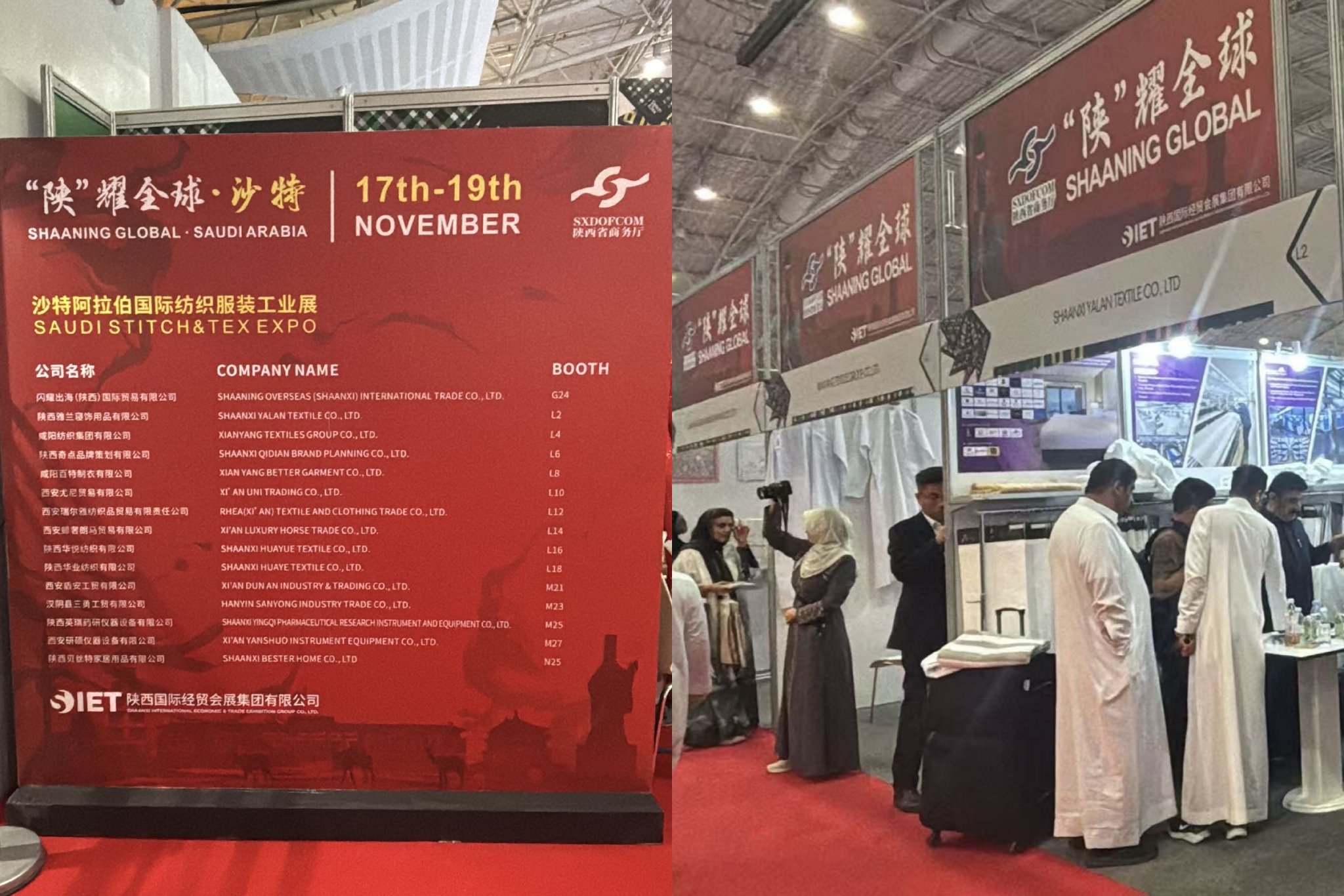 11月17日至19日,2025沙特阿拉伯国际纺织服装工业展在沙特阿拉伯利雅得国际会展中心成功举办。在陕西省商务厅大力支持和精心指导下,陕西国际经贸会展集团精准统筹、专业组织,成功带领咸阳纺织集团有限公司、陕西雅兰寝饰用品有限公司、陕西华业纺织有限公司等省内15家纺织龙头企业精彩亮相,展团凭借优质产品与专业表现收获满满,参展成效显著。