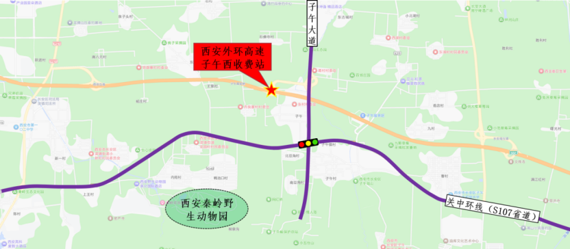 路口概况:关中环线与子午大道十字位于西安市长安区,路口以北为西安外环高速子午西收费站,向西通往西安秦岭野生动物园及沣峪口。该路口平日车流量较小,道路畅通;但周末及节假日期间,因旅游车辆集中往返,交通压力骤增,拥堵现象频发。