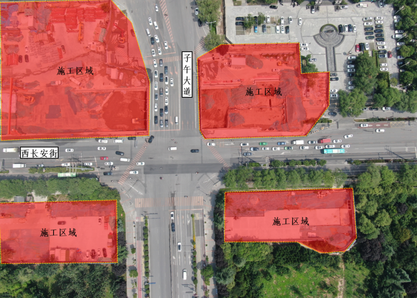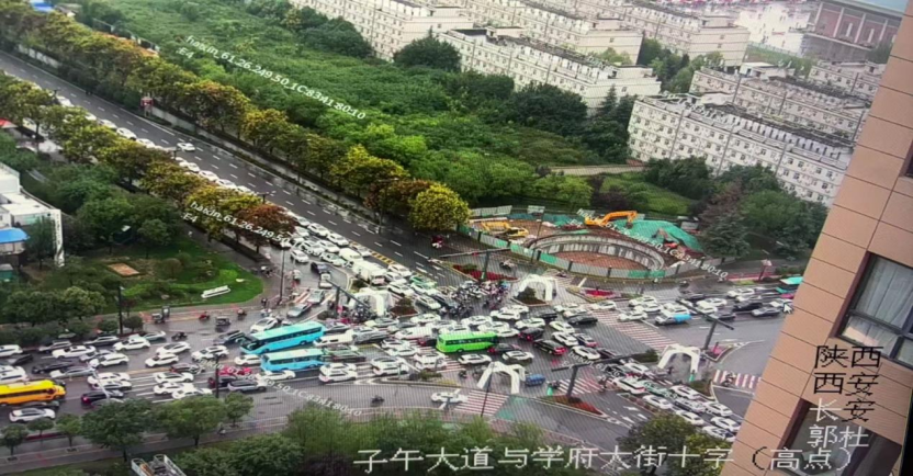 路口概况:西长安街与子午大道交叉口位于西安市长安区,是该区域的重要交通节点。西长安街为东西向城市主干道,西接高新技术开发区,东连航天新城,通勤交通特征显著。子午大道为南北向城市主干道,北通主城区,南达秦岭景区,在周末及节假日期间,由该路段往返城区与景区的旅游车流量大。路口周边分布着多个大型社区及多所学校,日常出行需求旺盛,交通压力大,拥堵频发。