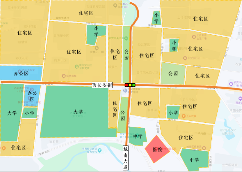 路口概况:学府大街与子午大道交叉口位于西安市长安区,是该区域的重要交通节点。学府大街为东西向城市主干道,西接高新技术开发区,东连航天新城,通勤交通特征显著。子午大道为南北向城市主干道,北通主城区,南达秦岭景区,在周末及节假日期间,往返城区与景区的旅游车辆较多,交通流量大。该路口周边分布有多个大型居住区,日常出行需求旺盛。此外,路口西南角为西安湖滨中学和西安湖滨小学,两校共有学生3000余人。上下学时段,接送学生车流集中,违停现象严重,常引发路口交通拥堵。
