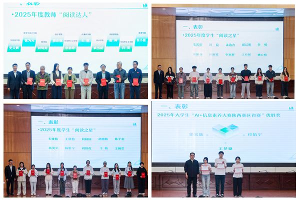 图书馆、档案馆副馆长王磊介绍了2026年阅读推广活动具体方案。教师代表白贤分享了自己对阅读的见解寄语广大学子“多读书、读好书、好读书”,通过阅读来拓宽视野、增长知识、提升素养。学生代表王欣怡也结合自身阅读经历,畅谈了阅读带来的收获与成长。大会还对在2025年度阅读推广活动中表现突出的集体与个人进行了表彰,并现场宣读了《咸阳师范学院大学生阅读倡议书》。